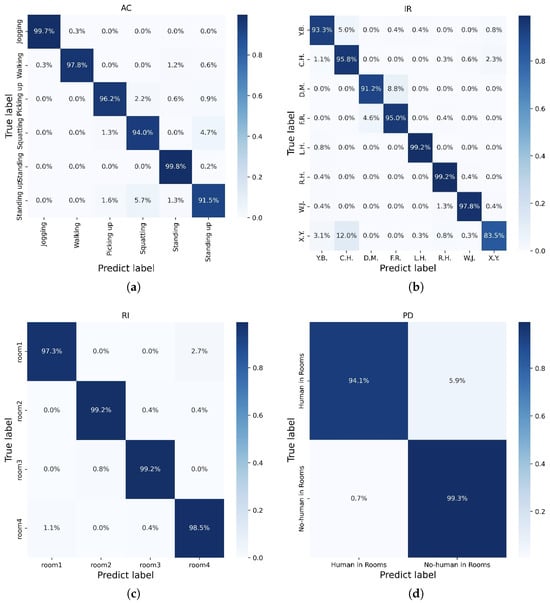 The confusion matrices of AC, IR, RI, and PD. (a) The confusion matrix of AC. (b) The confusion matrix of IR. (c) The confusion matrix of RI. (d) The confusion matrix of PD.
