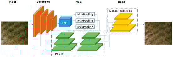 During the detection phase, users upload the UAV images they want to detect through the interface. These UAV images are processed by the YOLOv4 one-stage detector, utilizing trained weights for object labeling. In the YOLOv4 one-stage detector, UAV images are initially fed into CSPDarknet53 []. Subsequently, the Neck component integrates features using SPPNet and PANet. Finally, the Head component performs Dense Prediction to predict label results. The rice seedlings’ labels and total counts are displayed in the user interface, and the positions of the labeled seedlings’ centroids are saved in a text file.