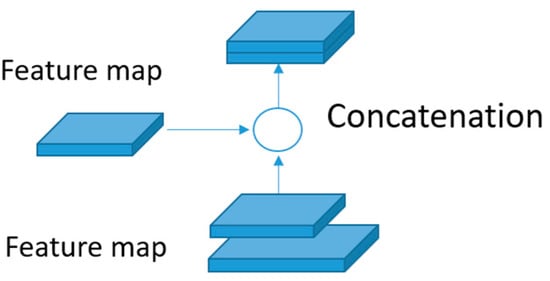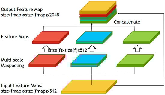The first module in the YOLOv4 architecture’s neck utilizes the spatial pyramid pooling (SPP) architecture proposed by Kaiming He et al. [] as shown in Figure 4. SPP enables the model to accommodate feature maps of different sizes, addressing the limitation of fully-connected layers that traditionally accept feature maps of a fixed size, leading to suboptimal performance when presented with images of different resolutions. In YOLOv4, the SPP module is enhanced by employing max-pooling with a larger k value (k = {1, 5, 9, 13}) and concatenating the output. This modification significantly increases the receptive field, contributing to improved model performance. The refined SPP mechanism in YOLOv4 is crucial for handling diverse resolutions in images, resulting in more robust and effective object detection.