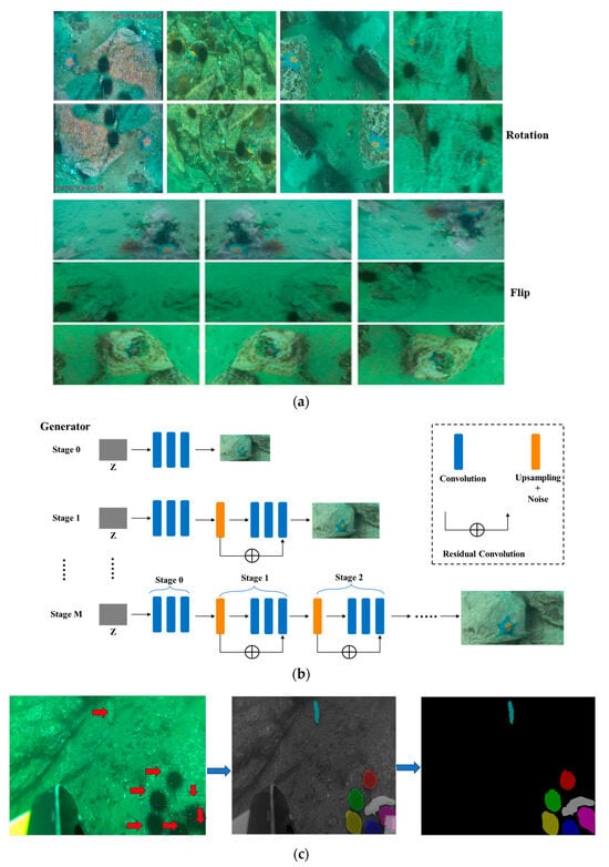 Construction of underwater image dataset. (a) Image rotation and flip; (b) image generated by ConSinGan; (c) image annotation. The red arrows indicate target locations.