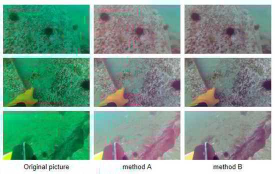 Figure 2 shows the results by using the improved white balance algorithm (marked as algorithm A) and the color channel separation correction of the Lab color model (marked as algorithm B) to remove the color bias of some underwater data sets. Compared with the original image, it can be seen that both algorithms have good color cast removal effect. Comparatively speaking, method A is better than method B, because the colors of different objects in the image processed by method A are more distinct.