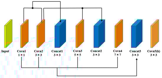 AOD estimates through a solution network (adaptive convolution network), and then obtains a deblurred image through Equation (14). The network structure of the AOD solution is shown in Figure 3. The features of different scales are obtained by convolution kernels of different sizes. The middle layer connects the coarse-scale network with the fine-scale network to make the information contained in the feature map more perfect. Conv1~5, respectively, represent five convolution layers, with the middle layer con.cat1 splicing the features of convolution layers 1 and 2, the middle layer con.cat2 splicing the features of convolution layers 2 and 3, and the middle layer con.cat3 splicing the features of convolution layers 1, 2, 3 and 4.