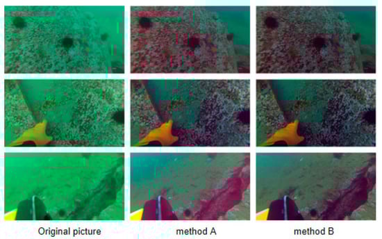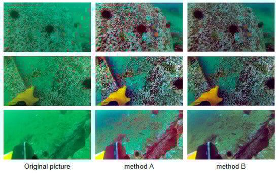 On the basis of deblurring, the CLAHE method was used to further enhance the underwater images. The results are shown in Figure 5. Compared with the original images, it can be seen that both methods have good enhancement effects. Moreover, the processing based on method A is better on the whole, with clearer details and the more obvious edges of the target.