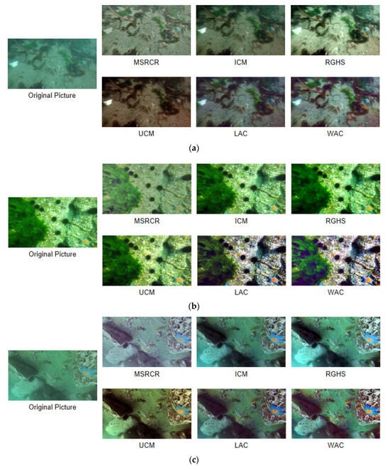 Four image enhancement algorithms (MSRCR, ICM, RGHS, UCM) and the two combinatorial optimization algorithms (WAC and LAC) proposed in this work were used to preprocess the data set, and the accuracy of the preprocessing method was verified. The results are shown in Table 7.