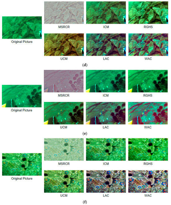 Underwater image enhancement by different algorithms. (a) Enhancement effect of No. 1 underwater image; (b) Enhancement effect of No. 2 underwater image; (c) Enhancement effect of No. 3 underwater image; (d) Enhancement effect of No. 4 underwater image; (e) Enhancement effect of No. 5 underwater image; (f) Enhancement effect of No. 6 underwater image.