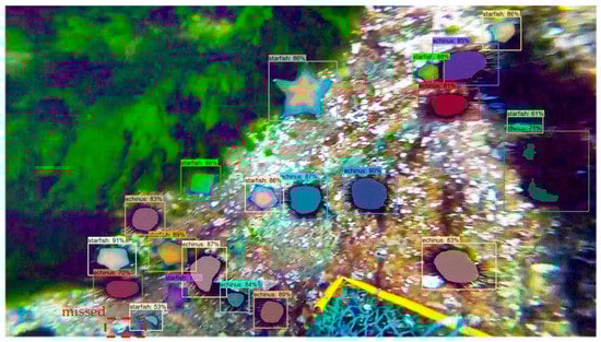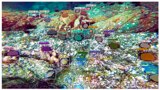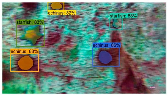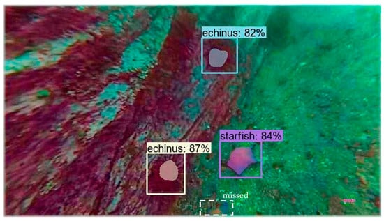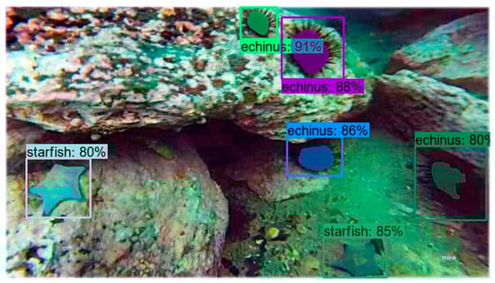 Figure 8, Figure 9, Figure 10, Figure 11, Figure 12 and Figure 13 illustrate the optimal outcomes of underwater image segmentation by using the FW method combined with six underwater images in which three kinds of underwater creatures, i.e., echinus, starfish and holothurian, are to be segmented. The number of targets to be segmented increases from the No. 1 image to the No. 6 image. The percentages in the graph are the probabilities of the target being recognized as the corresponding category. As can be seen, the probabilities are generally above 80%, which indicates that the proposed FW method can well achieve the segmentation of underwater image instances. In detail, in Figure 8, Figure 10 and Figure 11, the proposed FW method did not miss any targets and segmented the targets well. Figure 12 and Figure 13 show that the segmentation of underwater images containing many targets has also achieved good results. However, it should be noted that the segmentation effect is insufficient for incomplete targets at the edge of the image. As can be seen, one starfish at the bottom is missed for segmentation in Figure 9 and Figure 12, shown in dashed-boxes. In addition, the underwater environment is complex and diverse, which has an impact on the segmentation and recognition of underwater targets. For example, in Figure 12, the recognition probability of a starfish is only 53%, well below the average level. In Figure 13, two starfishes and several possible echini are missed for segmentation. Nevertheless, on the whole, the proposed method achieves the instance segmentation of underwater images well.