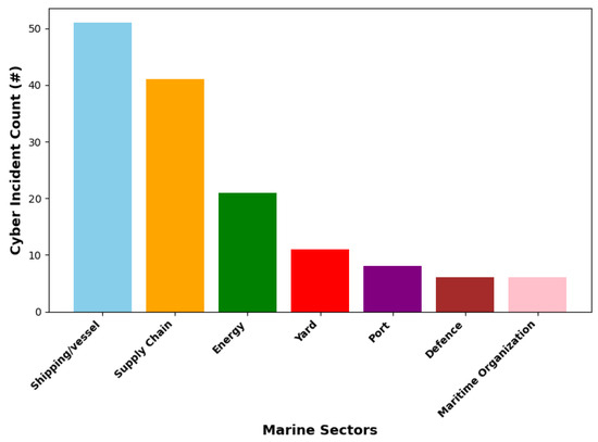 Cyberattack incidents within various marine sectors in 2023 where # signifies the cyber incident count.