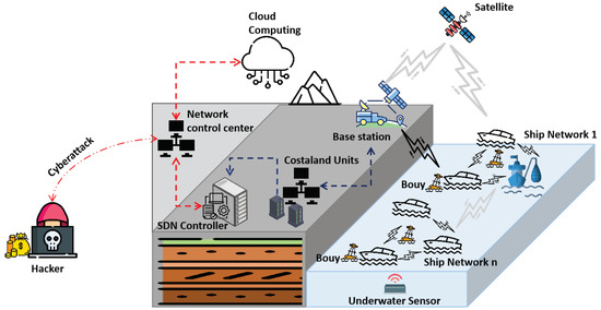 As shown in Figure 3, marine networks employ automated IoT and IoUT systems that foster ship-to-ship communication, which optimizes marine productivity while reducing operational costs. Marine network communication is characterized by interoperable nodes such as base stations, coastal units, and the Software-Defined Network (SDN) controller. The network control center transmits and receives several different wireless technologies, such as Long-term Evolution Advanced (LTE-A), Wireless Fidelity (Wi-Fi) networks, satellites, and acoustic communications (buoys) [17,18]. All marine communication nodes are geographically distributed among the different regions, including coastal, offshore, open-sea, or underwater communication endpoints to facilitate continuous communications and the running of the marine industry.