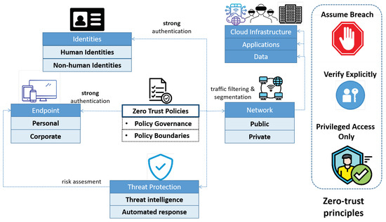 A visual illustration of the zero-trust cybersecurity principles, governed by strong authentication, filtering, threat intelligence, and zero-trust policies.