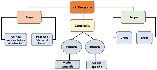 Within the domain of XAI, two categories of XAI periods (time of model explanation) post-hoc and ad-hoc, have been adopted for interpretable NIDS [8]. As illustrated in Figure 5, the current XAI taxonomy can be classified within time, complexity, and scope requirements. Concerning timely requirements, the ad-hoc explainability method provides model explanations during its decision process, while the post-hoc methods offer explainability information after model prediction in terms of intrinsic explanations, such as feature contributions to the model output. Commonly used post-hoc explainability methods in NIDS are SHAP and LIME. The SHAP and LIME explainers have become a favorite choice for explainable NIDS due to their model-agnostic features, while providing explanations to deep-learning-based NIDS models, which are fairly opaque in their decision-making process. Meanwhile, the complexity of interpretation methods can be classified as either extrinsic (model-agnostic) or intrinsic (model-specific). For example, tree-based (rule-based) NIDS models are inherently interpretable depending on the dataset or complex nature of training. As regards the scope of interpretations, XAI techniques can be categorized as either global or local [8].