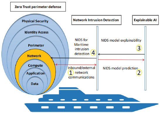 Current research into various cyberattacks, such as phishing attacks, botnets, and fraud, is gaining better insights, proper visualizations, and deeper forensics into the nature of these attacks. Additionally, significant features for model training can be identified to perform effective/trustworthy cyberdefense [8]. As depicted in Figure 6, NIDS approaches in IoT CPSs can model explainability and trustworthiness to evaluate the credibility of the predicted cyberattacks. Other layers of the zero-trust model cover areas such as physical barriers or mechanisms, which can help marine organizations to prevent, monitor, or detect unauthorized access to their assets through the use of locks, rails, CCTVs, badges, PC locks, turnstiles, and alarms. Important perimeter defenses includes identity access, perimeter security, compute, application security, and data integrity.