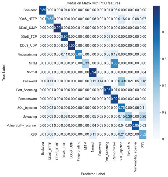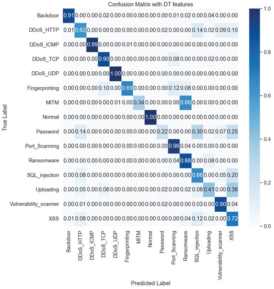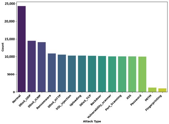 This work employs the most recent cybersecurity datasets for the proposed NIDS marine cyberdefense. The 202 EdgeIIoT dataset, published by Amine et al. [44], which includes diverse forms of cyberattacks, such as DoS/DDoS attacks, information gathering, man-in-the-middle attacks, injection attacks, and other malware attacks (15 classes), as shown in Figure 8, along with a 7-layer test-bed for ML-based NIDS tasks, is employed for our experiments. It comprises 64 features generated from a test-bed of the cloud computing layer, network functions virtualization layer, blockchain network layer, fog computing layer, software-defined networking layer, edge computing layer, and IoT and IIoT perception layer, which satisfies the critical requirements of IoT communications.