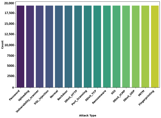Class distribution of the Edge IIoT 2023 dataset after oversampling using SMOTE.