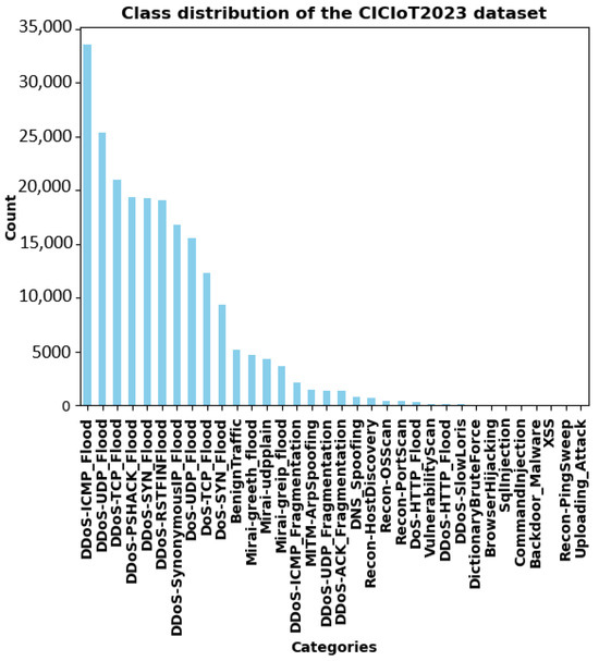 Class distribution of the CICIoT 2023 datasets employed for experimental analysis.