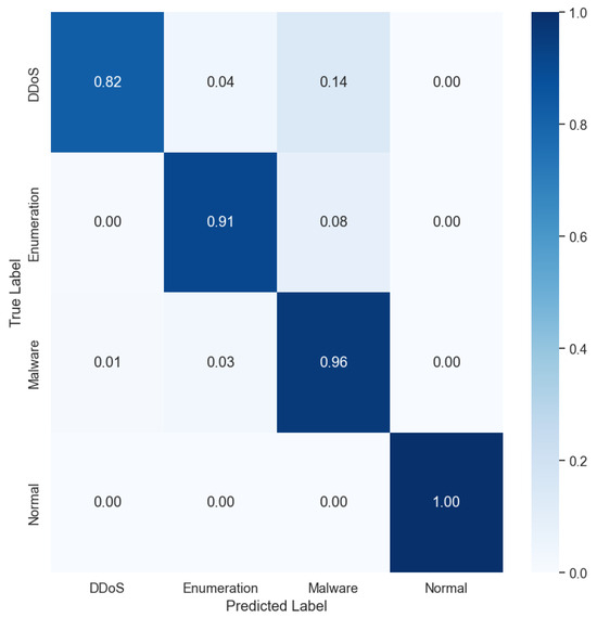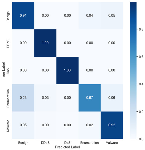 For further experimental evaluation, the significance of the proposed zero-trust NIDS model is evaluated with the CICIoT2023 dataset [46], as shown in Figure 10. The CICIoT2023 dataset was recently developed in a more extensive network of over 4 million entries and 33 attack types and over 105 IoT devices, including DDoS attacks, network traffic features of legacy industrial cyberattacks related to unauthorized commands, and denial of service attacks widely witnessed in critical IoT infrastructures. The two recent datasets, comprising the most closely representative real-world network traffic deliverables, offer valuable resources for advancing experimentation in the domain of NIDS.
