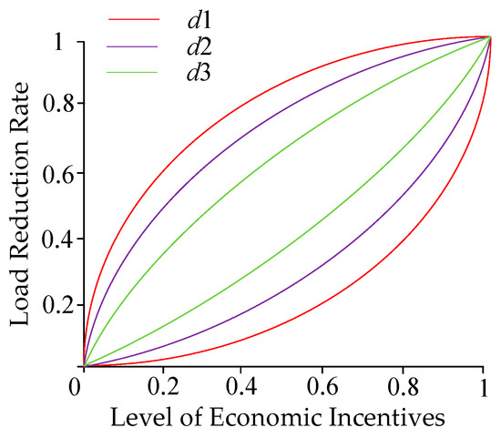 In the Figure 2, d1, d2, and d3, respectively, represent the upper and lower limits of reduction for users with high, medium, and low levels of variability. As can be seen from the above figure, when the level of price compensation is low, the actual degree of reduction by users is also low. As the level of compensation continues to increase, the response level of users also increases accordingly. However, when the level of price compensation reaches a certain level, the actual load reduction by users approaches the limit of their response capacity.