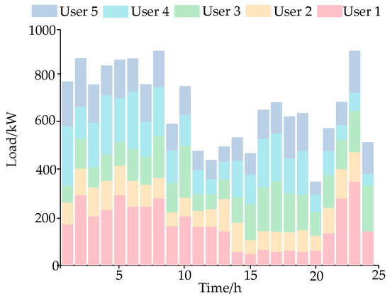 The compensation prices offered by the load aggregator to the users are 0.22 CNY/(kW·h), 0.22 CNY/(kW·h), 0.20 CNY/(kW·h), 0.23 CNY/(kW·h), and 0.21 CNY/(kW·h), respectively. According to Section 3.1, taking into account the impact of user response uncertainty, it is assumed when the economic incentive level j = 0.9, the load reduction rate under the condition of user heterogeneity d1 is extracted, determining the actual reduction amount of the user. At the same time, considering the influence of grid electricity prices on users, it is therefore set there is a difference in the reduction rate of users during peak and off-peak periods, as shown in Figure 6, thus obtaining the deviation of electricity for each user.