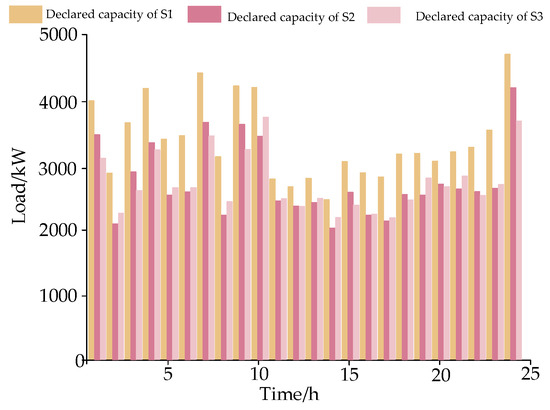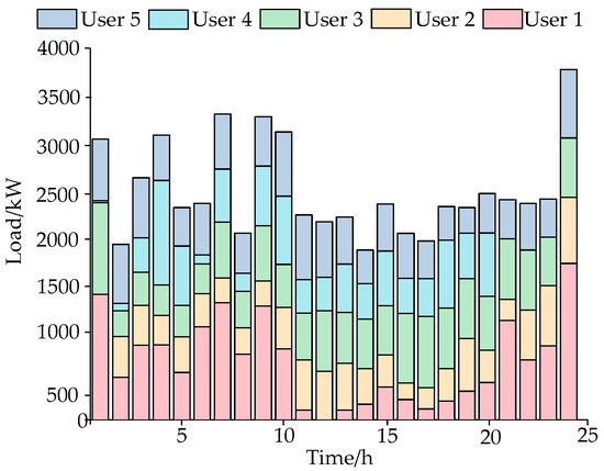 As the graph indicates, the maximum aggregation volume of the load aggregator occurs at 24:00, reaching up to 3739.559 kW·h. Moreover, the load aggregator’s aggregation volume can generally reach 2000 kW·h within the 24 h period. Therefore, by aggregating user-adjusted electricity through the load aggregator, the load in this area can be significantly reduced, thereby effectively improving the load curve of the power grid. Overall, the load aggregator’s aggregation capacity is roughly the same as its declared volume, with only a small amount of deviation. The difference is minimal between 11:00–13:00 and 18:00–23:00, which is due to the limitations of user adjustment capabilities. The load aggregator’s declared capacity, corrected after rolling forecasts, is close during this period. Although different users will have different adjustment capabilities, the values achieved after aggregation by the load aggregator will be similar.