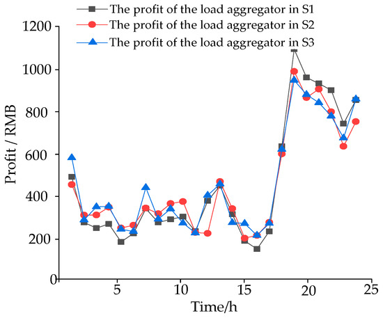 Figure 11 illustrates the profit variations of the load aggregator when selecting user aggregation and selling electricity to the grid under three scenarios across 24 periods. As can be seen from the figure, the level of profit variation for the load aggregator essentially aligns with the trend of electricity selling price to the grid. It is observable when the selling price of electricity is higher, a larger aggregation capacity can bring more profit to the load aggregator. Between 18:00 and 24:00, because the selling price of electricity by the load aggregator is higher, the profit that the load aggregator can obtain is greater than other periods. Notice the aggregation profit of scene 1 from 18:00–23:00 is higher than the other two scenes, this is because this paper sets the deviation penalty price as a step-type penalty, when the response deviation is greater than 0.4 the penalty price is the real-time price of electricity, and by the aforementioned time period belongs to the valley time period, the declared amount of scene 1 decreases to a larger extent, and the price of electricity is relatively low, so its aggregation of a higher return and a lower cost of the penalty and the obtains a higher profit. However, such a capacity declaration strategy is not conducive to the long-term development of the aggregator and is not conducive to the real-time scheduling of the grid, so this paper does not recommend this form of responsive power declaration.