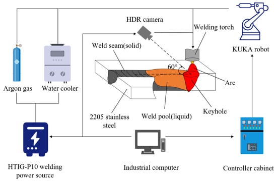 As a welding method with high energy input, K-TIG welding plays a crucial role in the field of medium–thick plate welding. Medium–thick material plates, like titanium alloy, duplex stainless steel, and low carbon steel, can perform a single-sided weld and a double-sided form in a single pass without opening grooves [1,2,3]. It is often combined with robots for automatic welding in practical industrial production, but it is still difficult to achieve precise real-time regulation during the complex welding process. To improve the intelligent automation level of welding technology, scholars have paid much attention to monitoring the welding process [4].