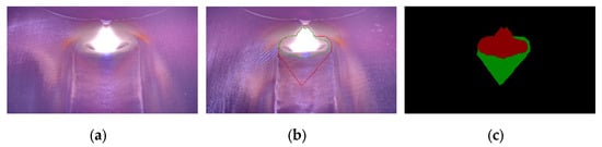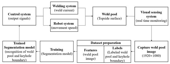 Figure 2 shows the flowchart of the experiment procedure. When started, signals were output from the industrial computer to the welding power source and controller cabinet, controlling the weld current and movement speed. Under the action of the heat source, the workpieces began to melt from the surface into the interior, forming the weld pool and keyhole. Simultaneously, as the robot started to move, the HDR camera was triggered to monitor and capture images of weld pools as well as keyholes. These images were then transmitted to the industrial computer for use as inputs in the segmentation model. During the training process of the model, the areas of the weld pools and keyholes were manually labeled in the captured images, as shown in Figure 3. The trained segmentation model was subsequently utilized to recognize the actual edges of the weld pool and keyhole.