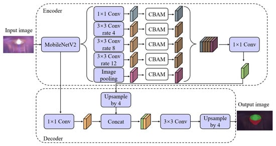 In the experiment, the complicated structure of the Xception network will result in some blurring and confusion problems in detail extraction for the weld pool and keyhole. The large number of parameters in Xception necessitates a significant investment of time and computing power, so MobileNetV2 is selected as the backbone feature extraction network. MobileNetV2, with fewer parameters and faster training speed, accelerates feature extraction in molten pool images. This facilitates improved detail capture for the weld pool and keyhole, rendering it more suitable for molten pool extraction tasks. At the same time, given the differing characteristics of the weld pool and keyhole, it is not suitable to apply the DeepLabV3+ model directly to the molten pool segmentation. The improved DeepLabV3+ model architecture is shown in Figure 5.