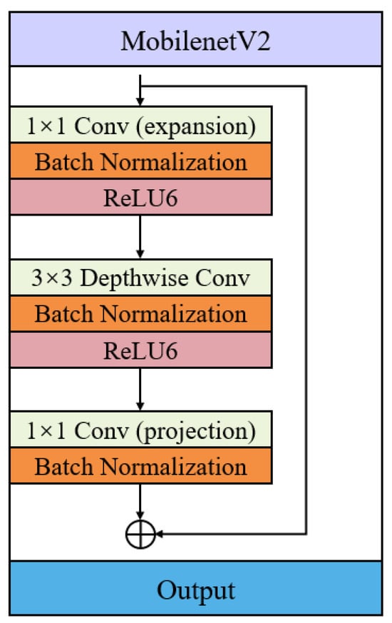 MobileNetV2 is used as the backbone feature extraction network, and its network structure is shown in Figure 6. MobileNetV2 adopts an inverted residual block structure, which gives the network a good ability for feature extraction while maintaining a small number of parameters and computational complexity. First, the dimension of the input feature map is expanded by 1 × 1 convolution, followed by the utilization of ReLU6 for feature non-linearization. Then, 3 × 3 depthwise separable convolution and the ReLU6 activation function are employed to comprehensively extract and non-linearize features. Finally, feature fusion and dimensionality reduction are carried out through 1 × 1 convolution.
