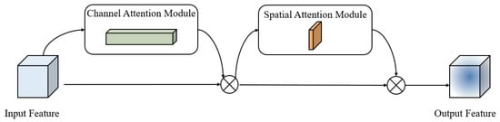 The CBAM is a lightweight attention module proposed by Woo et al. [25]. It infers the attention weights independently along the two dimensions: channel and space. The resulting weights are then multiplied by the input feature to adaptively adjust the features. The introduction of CBAM into the CNN can greatly improve the performance of the model, and it brings a very small number of parameters and computations, which can be embedded into most networks. The structure is shown in Figure 7.