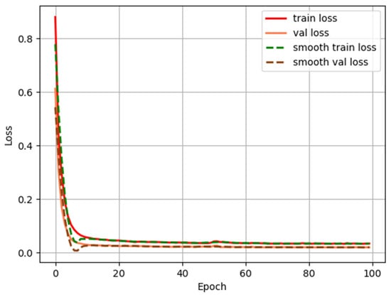 After 100 epochs of training, the change in the loss value during model training and validation is shown in Figure 8. As we can see in the figure, with the increase in training time, both training and validation loss curves rapidly converge and then stay stable. When the time of training reaches 60, the loss value reaches 0.03. To assess the effectiveness of the DeepLabV3+ network, the mean intersection over union (MIOU) was adopted to calculate and evaluate the percentage overlap between the target and prediction, which is defined in Equation (1).