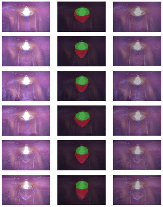 The best-performing network model from the verification set was employed for testing on additional molten pool images. The images before and after the segmentation are shown in Figure 9. It can be observed in the figure that the boundaries of the weld pool and keyhole are successfully recognized by the trained DeepLabV3+ network. The network can process the images at 103 frames per second, i.e., the inference time of a single image is only 9.62 ms. Such a speed ensures efficient deployment and application for monitoring the K-TIG welding process.