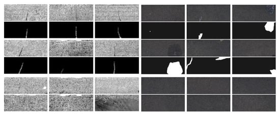 The rail surface defect detection (RSDD) dataset is a standard dataset for rail inspection. The RSDD dataset includes two types: the Type-I RSDD dataset, with 67 challenging images captured from fast rail, and the Type-II RSDD dataset, with 128 challenging images captured from transport rail. Surface defect images in the Type-I RSDD dataset have a fixed width of 160 pixels but vary in height between 1000 and 1282 pixels. In contrast, surface defect images in the Type-II RSDD dataset have a fixed resolution of pixels. For convenience in calculations, surface images from the Type-I RSDD dataset are scaled to a fixed size, similar to those in the Kolektor dataset. Examples of such images are exhibited in Figure 2. Meanwhile, in order to train our proposed model, we cropped the original images and performed the image enhancement process. This resulted in 67 defective images and 201 defect-free images for the RSDD Type-I dataset, and 128 defective images and 384 defect-free images for the RSDD Type-II dataset.