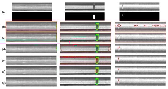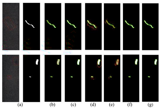 Detection results of the six network models under the KolektorSDD2 dataset. Columns from left to right are represented by (a). Original image; (b). Lraspp-mobilenetV3; (c). Deeplabv3-resnet50; (d). Fcn-resnet50; (e). U-Net; (f). AnatomyNet; (g). Our proposed approach. Each row represents one sample image. Red denotes the predictions. Green represents the ground truths.