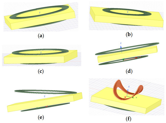 Six different models simulated in Ansys Maxwell 3D. The colored arrows represent the coordinate axis. (a) Coils simulation model 1, two larger non-flexible coils of the same size. (b) Coils simulation model 2, two smaller non-flexible coils of the same size. (c) Coils simulation model 3, two non-flexible coils of different sizes. (d) Coils simulation model 4, a larger non-flexible coil and a smaller non-flexible coil, and the centers of the two coils are not aligned. (e) Coils simulation model 5, a larger non-flexible coil and a smaller non-flexible coil, and one coil of the two is titled. (f) Coils simulation model 6, a larger non-flexible transmitter coil and a smaller flexible receiver coil.