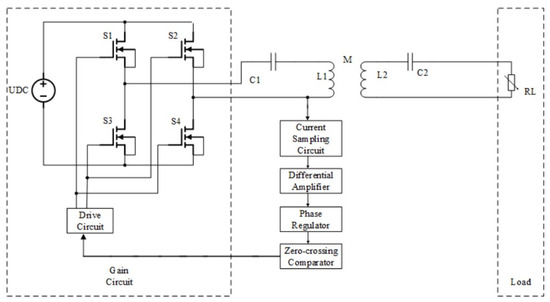 The current sampling circuit converts the sampled current signal into a voltage signal, which is then amplified by a differential amplifier circuit. Due to the delay caused by the transistor on and off in the whole circuit, phase compensation is required, and the purpose of adjustment is achieved through the phase adjustment circuit. The signal in the circuit then passes through the zero-crossing comparator to obtain the signal used to control the work of the driving circuit, and through the driving circuit with dead time control, the PWM control signal is generated to control the on–off of the switching device of the full-bridge inverter, and finally make the voltage and current outputs of the full-bridge inverter have the same frequency and phase, so as to make the power supply composed of the full-bridge inverter be in the state of negative resistance, which can then achieve the WPT system based on the PT symmetry condition.