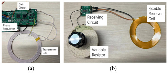 Based on the calculations shown above, a WPT system based on the PT symmetry mechanism is designed as shown in Figure 3. The transmitter of the system is mainly composed of a DC power supply , a current sampling circuit, a differential amplifier, a phase regulator, a zero-crossing comparator, a driver circuit with dead band adjustment, a full-bridge inverter, a transmitter coil resonance compensation capacitor , and a non-flexible transmitter coil ; and the receiver is mainly composed of a rectifier, a load resistor , receiver coil resonance compensation capacitor , and a flexible receiver coil .