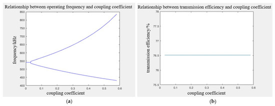(a) Relationship between operating frequency and coupling coefficient. (b) Relationship between transmission efficiency and coupling coefficient.