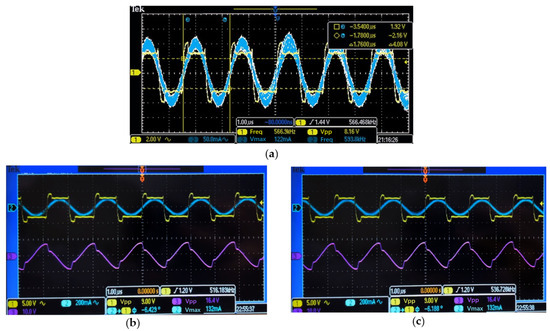 (a) Output voltage and current of the inverter circuit when debugging negative resistance. This output voltage and current both have a frequency of 566 kHz and the same phase. (b) Output voltage and current of the inverter circuit and the received voltage of the receiver. The frequency is 536 kHz, and the received voltage is 16.4 V. (c) Output voltage and current of the inverter circuit and the received voltage of the receiver. The frequency is 516 kHz, and the received voltage is 16.4 V.