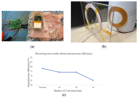 On this basis, the efficiency of energy transmission under different degrees of bending of the flexible coil at the receiving end was investigated. According to the simulation results in Section 2.2, we found that the coupling coefficients of the coils in different bending cases exceed those of the system, so it could be assumed that the system is able to work within the PT-symmetric strong coupling region. We then verified this through an experiment. The experimental setup is shown in Figure 8. Keeping the distance between the centers of the coils at the transmitting end and the receiving end at 15 mm and separating the coils by a piece of pig skin that represents the human tissue, the flexible receiving coil was placed against a cylinder with different radii to represent the flexible coils with different degrees of bending. Figure 8a shows the experimental setup in the presence of pig skin, where the transmitting coil is placed under the pig skin, the receiving coil is attached to the cylinder for bending, and the cylinder is held in the hand for testing. Figure 8b shows the bending of the coil when it is leaned against the cylinder, and the pig skin is removed to especially display the situation clearly. The results are shown in Figure 8c and Table 5.