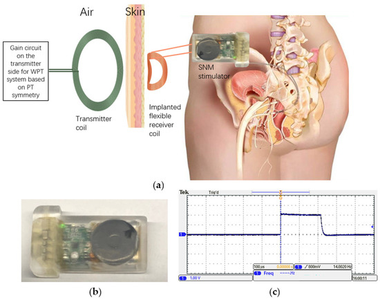 The proposed WPT system can be used in the SNM stimulator as schematically shown in Figure 9a. The stimulator and the electrode will be implanted in vivo, and the electrode will be placed near the stimulation site on the sacral nerve, which requires long-term intermittent electrical stimulation. The receiver circuit module is directly connected to the stimulator power supply module, but it is not integrated yet. The receiving coil is placed outside the whole stimulator for energy transmission. When the battery is exhausted, wireless charging can be performed by placing the transmitter circuit close to the skin under which the flexible coil of the stimulator is located. The stimulator was designed to be flexible by using flexible printed circuit board, coil printed on PI substrate, and shell made of PDMS. We charged the stimulator by wireless charging based on the PT symmetry theory. The safety standards of this article were developed in accordance with the implantable medical electronic device standard ISO 14117 and IEC 60601 [13,14]. After connecting the electrode to the stimulator and making the stimulator work, a 2 V and 14 Hz constant voltage signal could be measured on an oscilloscope at the output of the stimulator, which meets the needs of the SNM stimulator. Figure 9b illustrates the physical picture of the developed flexible SNM stimulator. We connected the SNM stimulator output electrodes to an oscilloscope, performed tests against the output condition, and measured its output as shown in Figure 9c. A 2 V and 14 Hz constant voltage signal output could be obtained. The stimulation waveform meets the sacral nerve stimulation demand. The feasibility study demonstrated that the developed PT symmetry mechanism based WPT system is capable of transferring high power wirelessly, and it is sufficient for the proposed LUTD treatment application. Furthermore, studies on system integration, charging temperature regulation, device miniaturization, and flexibility are in progress to clarify all issues pertaining to the practical application of the system.