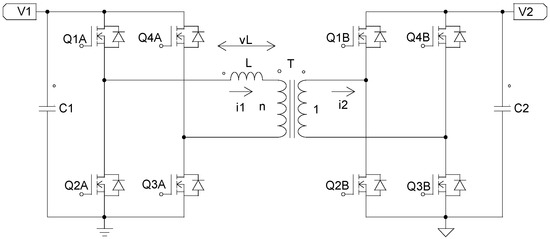 The most immediate solution for the BDC consists of a simple bidirectional DC/DC converter [9], but for safety reasons, this converter must have galvanic isolation; these are the isolated bidirectional DC–DC converters (IBDC). The most accepted solution is a converter that uses two full bridges of transistors (dual active bridges—DABs) [10] or two half-bridges (dual active half-fridges—DAHBs) [11] connected so that the output of one is the input of the other. For large power levels, this topology can be optimized by using multiphase DABs [12]. One way to improve efficiency and electromagnetic interference (EMI) emission is the use of resonant DABs [13] or by means of broadband devices such as silicon carbide (SiC) [14] and gallium nitride (GaN) [15].