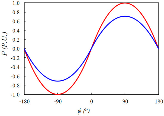 Figure 4 shows the evolution of the transferred power in units normalized to the maximum power value given in (10) as a function of the phase ϕ for the minimum and maximum values of the voltage V2 of the battery. The power transferred during the charging or discharging process at maximum output current (positive or negative) should remain between the two curves.