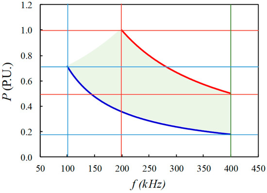 Transferred power of the VF-IBDF converter versus switching frequency. The red line corresponds to V2 = 400 V, and the blue line corresponds to V2 = 285 V.