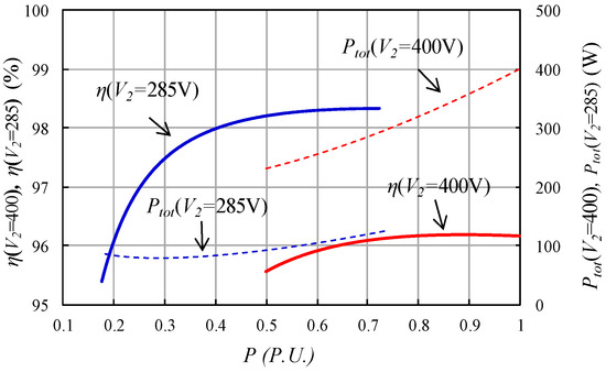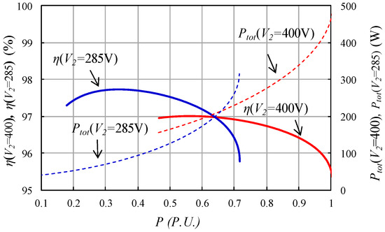 Figure 7 shows the evolution of the power losses and the efficiency of the VF-IBDC converter for different values of the output power expressed in normalized units referring to the value of the maximum output power. When the battery has its minimum voltage value (285 V), the loss and efficiency curves are shown in blue, while for the maximum voltage value (400 V), the curves are red. As the maximum charging current is the same in both cases (25 A), the maximum power obtained is reduced from 10,000 W to 7125 W when the battery voltage goes from 400 V to 285 V.