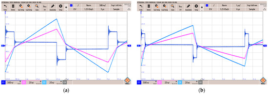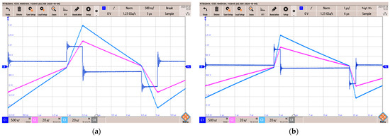 Experimental waveforms of the VF-IBDC in charge mode with V1 = 385 V and V2 = 400 V (a) when P = 10 kW and (b) when P = 7125 W. C1 (dark blue) is the inductor voltage (500 V/div), C2 (magenta) is the primary bridge output current (20 A/div), and C3 (light blue) is the secondary bridge input current (20 A/div). Time base is 0.5 µs/div.