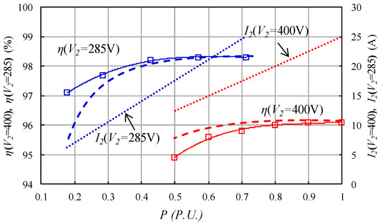 Finally, Figure 13 shows the experimental measurements of the efficiency in charge mode regulating the output current until 25 A with V1 = 385 V when V2 is 400 V (red lines) and 285 V (blue lines). The results obtained in discharge mode were very similar. Note that there are some differences between the experimental and calculated results that may be due to the modeling method used, the existence of losses of other elements not taken into account in the calculation (capacitors, conductors, parasitic components, voltage and current sensors, etc.) and also the measurement process.