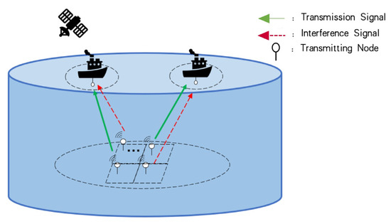 In this paper, we consider a UACN consisting of transmitter nodes and receiver nodes, where the transmitter nodes are deployed at the water bottom and each node is configured with an underwater acoustic transducer, as shown in Figure 1. We use and to denote the transmitter nodes and the receiver nodes, respectively. Thus, there are links in the system. When a node transmits the signal to the target receiver, the signals from other transmitter nodes are considered as interference. We assume that the transmission of all nodes in the network starts and ends at the same time slot for a duration of .