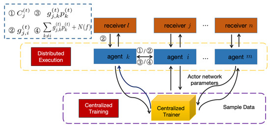 In this paper, we regard each transmitter node as an agent. Therefore, there are multiple agents in the system. The multi-agents must consider both their observations and other agents’ actions, and their actions also affect surrounding agents’ policies. To obtain a collaborative advantage, the CTDE framework is used in this paper to train the network by the centralized trainer, as is shown in Figure 3. Each agent interacts with the environment and other agents with the information exchange demonstrated by ①/②/③/④. The central trainer includes the actor and critic training networks of all agents and their respective target networks. Training samples come from experiences sent by each agent and stored in replay memory . During the centralized training, the central trainer selects the samples randomly from and updates AC network parameters via DDPG. After central training, the trainer broadcasts new actor parameters to each agent. For the distributed execution, the individual agent executes its action output by its local actor and then receives rewards and moves to the new state. A new sample experience is then obtained by each agent, which is sent back to the central trainer.