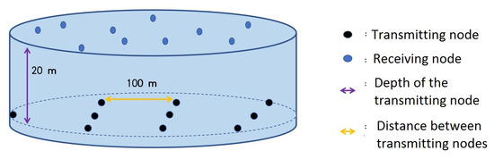 According to [24], the underwater sensor nodes are anchored and restricted by a cable, which can float in water. The nodes move at a speed of 0.83–1.67 m/s within the limit of the cable length [24]. We adopt a moving speed of 0.9 m/s in the simulation. Therefore, the maximum Doppler frequency is 12 Hz. To avoid the space–time uncertainty caused by the long propagation delay of underwater acoustic transmission, we assume that the time slot length is long enough to complete information exchange and power allocation in the same time slot. Based on transmission distance and sound velocity, the time slot is assumed to be 2 s.