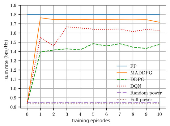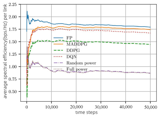 Figure 5 shows that the proposed MADDPG algorithm obtains a better sum rate compared with other power allocation strategies. The sum rate here refers to the sum channel capacity of all links. The sum rate of the proposed MADDPG power allocation remains above , in which the means bits per second. The FP algorithm is a model-driven method and has full CSI, whereas the deep learning methods such as DQN, DDPG, and MADDPG are only data driven without full CSI, resulting in lower performance than the FP algorithm. In the DQN and DDPG algorithms, each single agent is trained independently without interacting with the surrounding environment. However, the agents in MADDPG interact with each other and can use global data for centralized training, which obtains a better performance than DQN and DDPG. Random power and full power do not optimize power allocation, thus resulting in the worst performance.