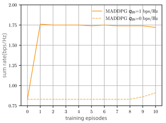 In the objective function , the threshold is required to ensure the minimum channel capacity of each link. Figure 7 compares the sum rate of MADDPG power allocation with () and without () minimum channel capacity constraint. The algorithm considering maintains a channel capacity of approximately 1.75 bps/Hz which performs 75% higher than that of without considering minimum channel capacity. Therefore, considering the minimum channel capacity constraint and penalty for interference in the reward function of our algorithm, each link can ensure a minimum channel capacity, which improves the system sum rate.